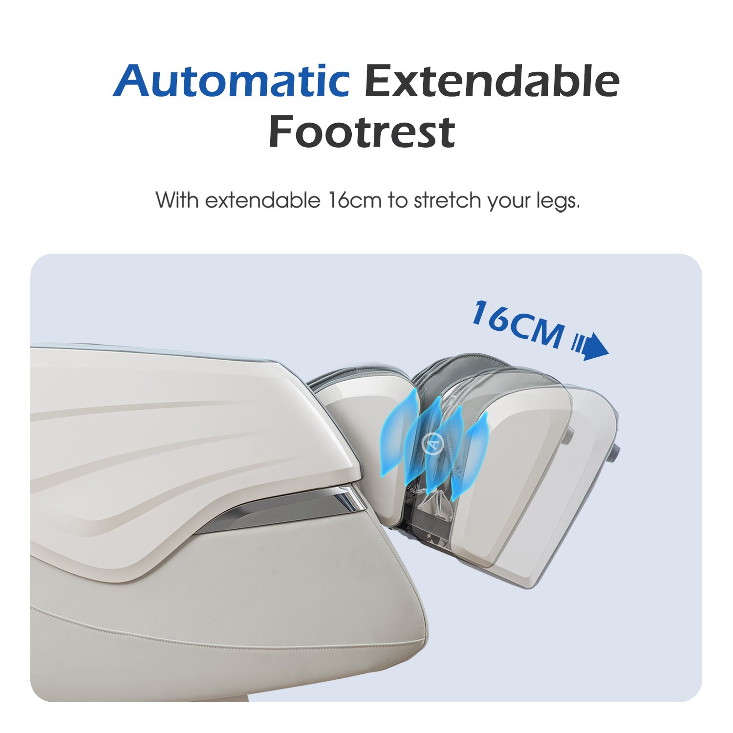 Automatic Extendable FootrestThe massage chair is equipped with a leg airbag that extends 16 cm, which is automatic and provides the user with a more comfortable and effective massage experience.