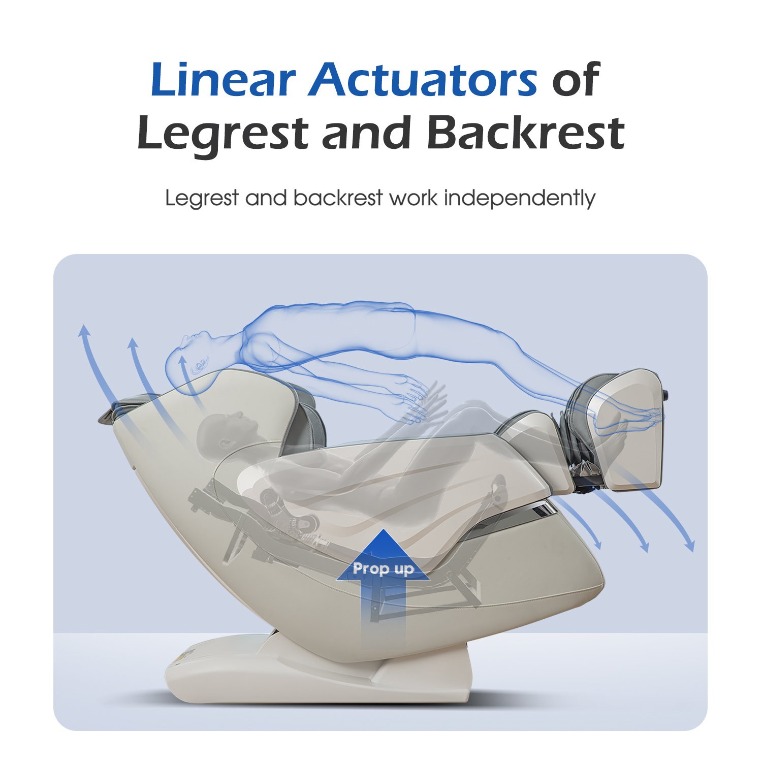 Linear Actuators of Legrest and BackrestThe massage chair features independent linear actuators for the legrest and backrest, allowing them to work separately. This enables customized positioning and targeted relaxation, ensuring a personalized and rejuvenating experience for the user.
