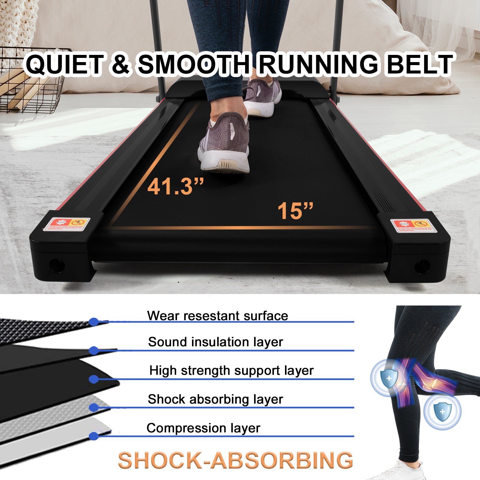 The 14.9' x 41.3' large-area rubber running belt within compact duty treadmill is shock-absorbing and non-slip. It provides more comfortable and more sturdy workout experience; you will have plenty of run to walk or run for all types of users.