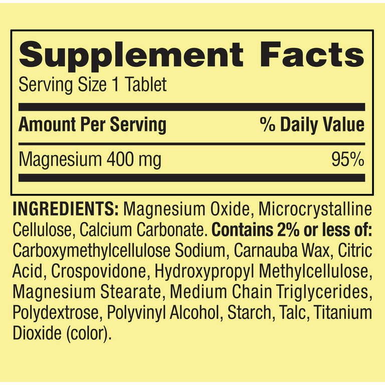 Our Spring Valley Extra Strength Magnesium Bone and Muscle Health Dietary Supplement Tablets are specially formulated to provide a nutritional boost to your nerve, muscle, and heart health.* Magnesium is also essential in the formation of bone, making it beneficial to your skeletal system.* Each tablet contains 400 milligrams of magnesium, which is 95 percent of the recommended daily value of this essential mineral. These tablets are free of gluten, lactose, artificial flavors and synthetic dyes. You can rest assured that Spring Valley Extra Strength Magnesium Bone and Muscle Health Dietary Supplement Tablets are produced with strict quality guidelines and are backed by our quality guarantee.
